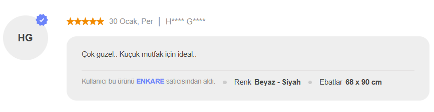 Ürün gayet güzel kullanışlı dar mutfaklar için çok ideal horoz lojistikle gönderilince geç gelir diye düşündüm ama kısa sürede teslim edildi üstelik ürün hiç zarar görmemişti