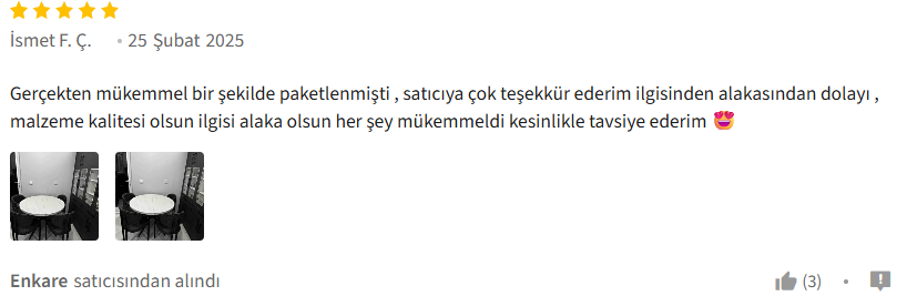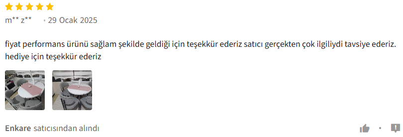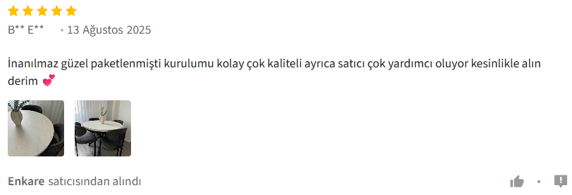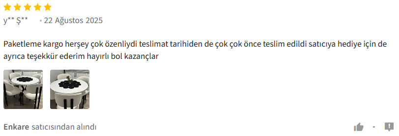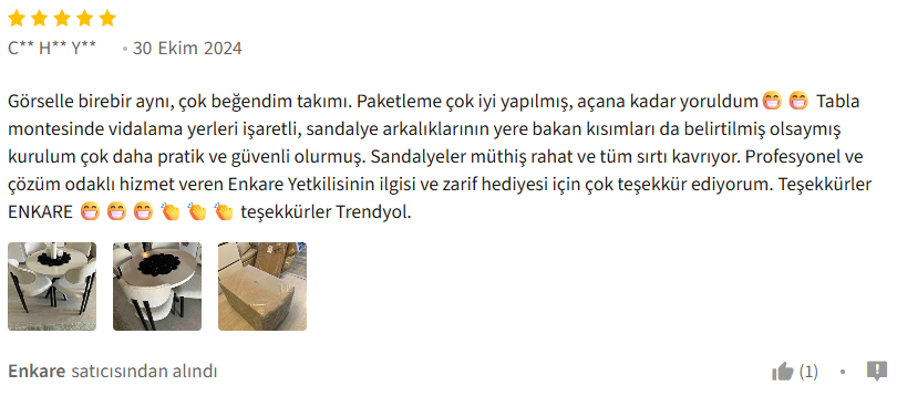 Görselle birebir aynı, çok beğendim takımı. Paketleme çok iyi yapılmış, açana kadar yoruldum😁😁 Tabla montesinde vidalama yerleri işaretli, sandalye arkalıklarının yere bakan kısımları da belirtilmiş olsaymış kurulum çok daha pratik ve güvenli olurmuş. Sandalyeler müthiş rahat ve tüm sırtı kavrıyor. Profesyonel ve çözüm odaklı hizmet veren Enkare Yetkilisinin ilgisi ve zarif hediyesi için çok teşekkür ediyorum. Teşekkürler ENKARE 😁😁😁👏👏👏 teşekkürler Trendyol.
