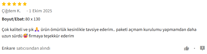 Çok kaliteli ve şık🙏 ürün ömürlük kesinlikle tavsiye ederim.. paketi açmam kurulumu yapmamdan daha uzun sürdü😅firmaya teşekkür ederim
