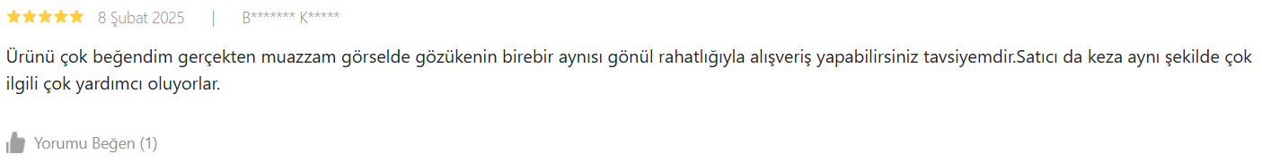Ürünü çok beğendim gerçekten muazzam görselde gözükenin birebir aynısı gönül rahatlığıyla alışveriş yapabilirsiniz tavsiyemdir.Satıcı da keza aynı şekilde çok ilgili çok yardımcı oluyorlar.