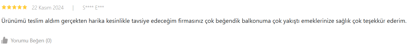 Ürünümü teslim aldım gerçekten harika kesinlikle tavsiye edeceğim firmasınız çok beğendik balkonuma çok yakıştı emeklerinize sağlık çok teşekkür ederim.