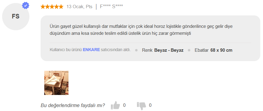 Ürün gayet güzel kullanışlı dar mutfaklar için çok ideal horoz lojistikle gönderilince geç gelir diye düşündüm ama kısa sürede teslim edildi üstelik ürün hiç zarar görmemişti